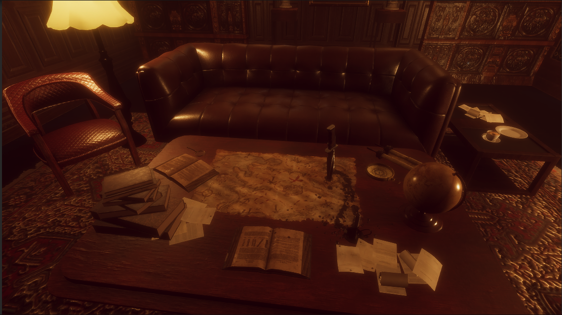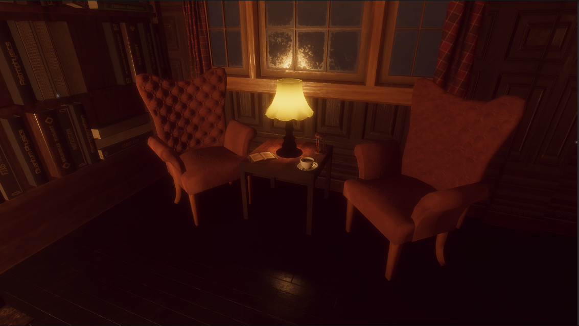 Cozy Sitting Area: A seating corner by the window featuring emissive-lit lamps and wooden flooring, where specular highlights subtly reflect the scene’s warm lighting to enhance realism and comfort.